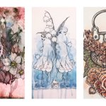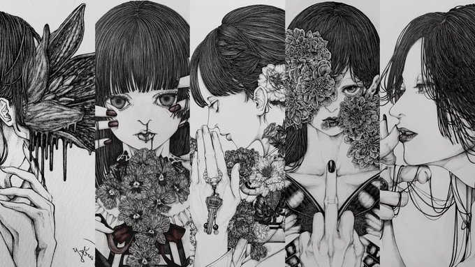 いつもお花を咲かせています、 最後の一枚は翡翠さんとの合作で個人的に大好きな作品(苺を描きました) #お花作品鑑賞会 #ペン画