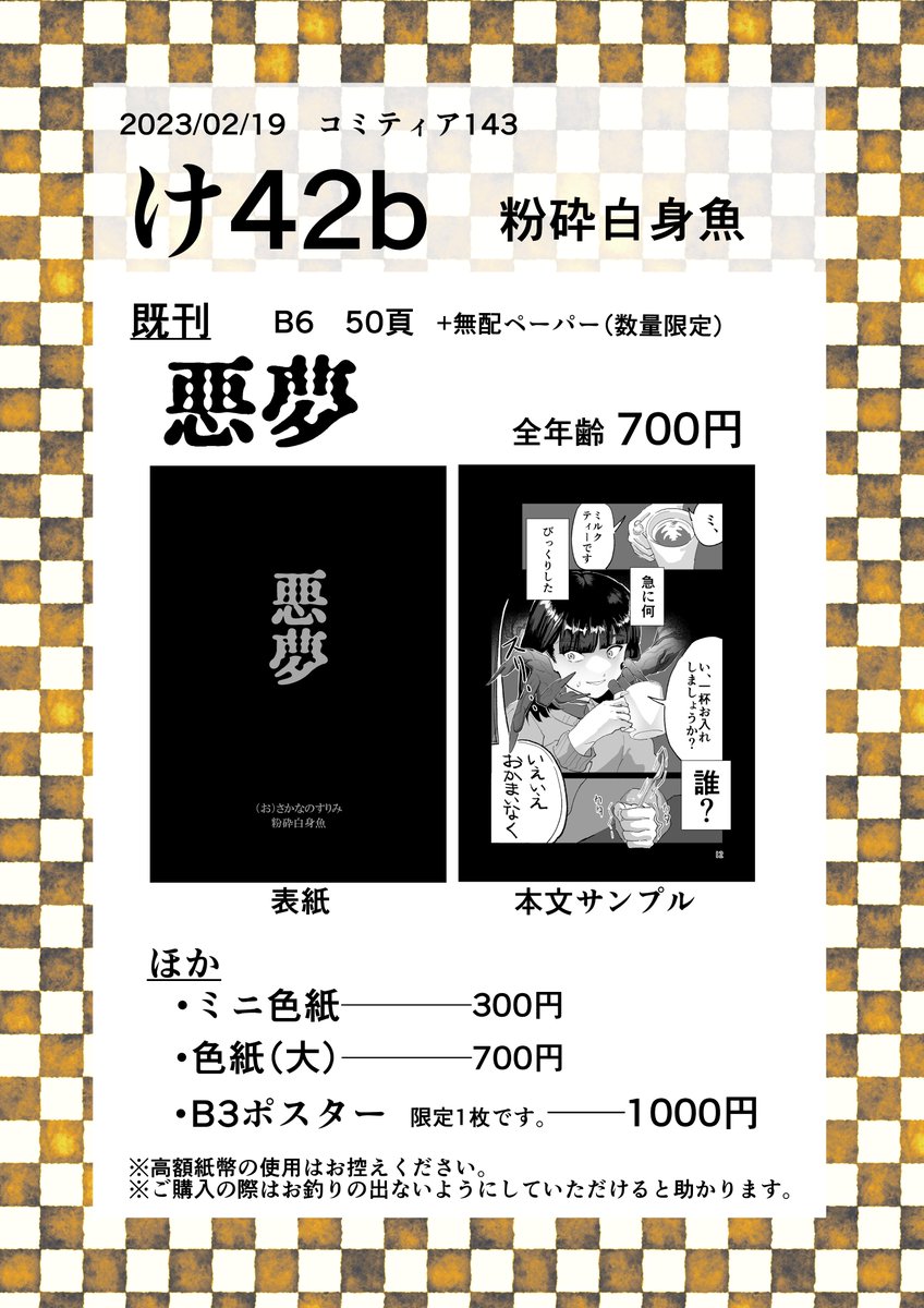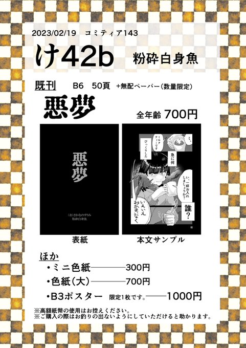 明日の #コミティア143 #COMITIA143 に参加します! スペース「け42b」です。 既刊と色紙(大/小)とポスター、シークレットでポストカードを用意しております。 スケブも受け付けます!!