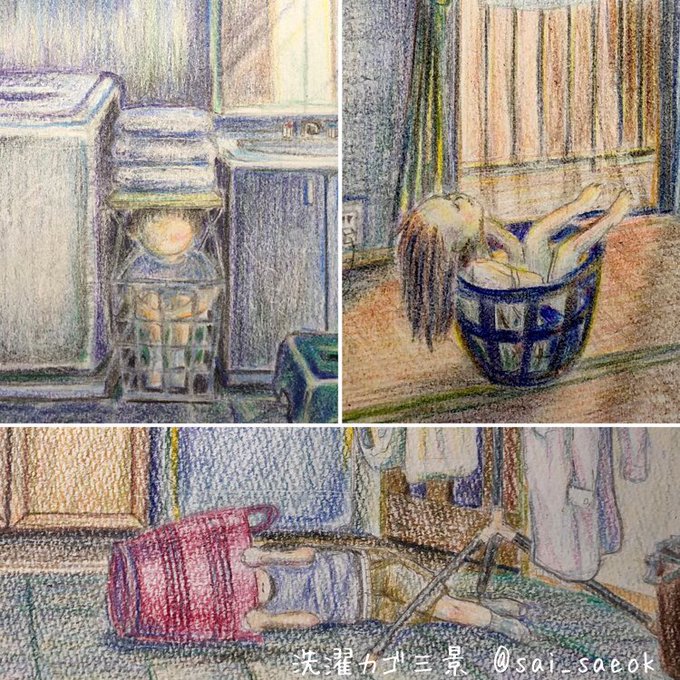 洗濯カゴ三景〜③〜 籠城 やっとこさ色塗りました! 今回の色塗りは及第点といった感じですが洗濯カゴの部分はかなり好き。絶対IKEAに売ってる。 #イラスト #イラスト好きさんと繋がりたい #みんなで楽しむTwitter展覧会 #アナログ画 #オリキャラは性癖の見本市