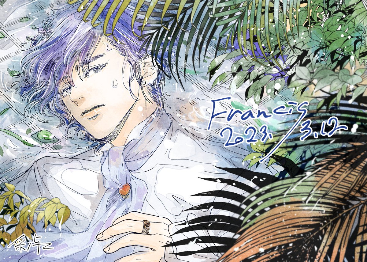 お天気の良い日の曜日を毒草とともに過ごされるフランシスさまを描きました。 フラ様と、聖獣の宇宙特有の亜熱帯風植物との融合の妙がとても好きです… フラ様、お誕生日まことにおめでとうございます!🙏✨ #フランシスさま聖誕祭2023