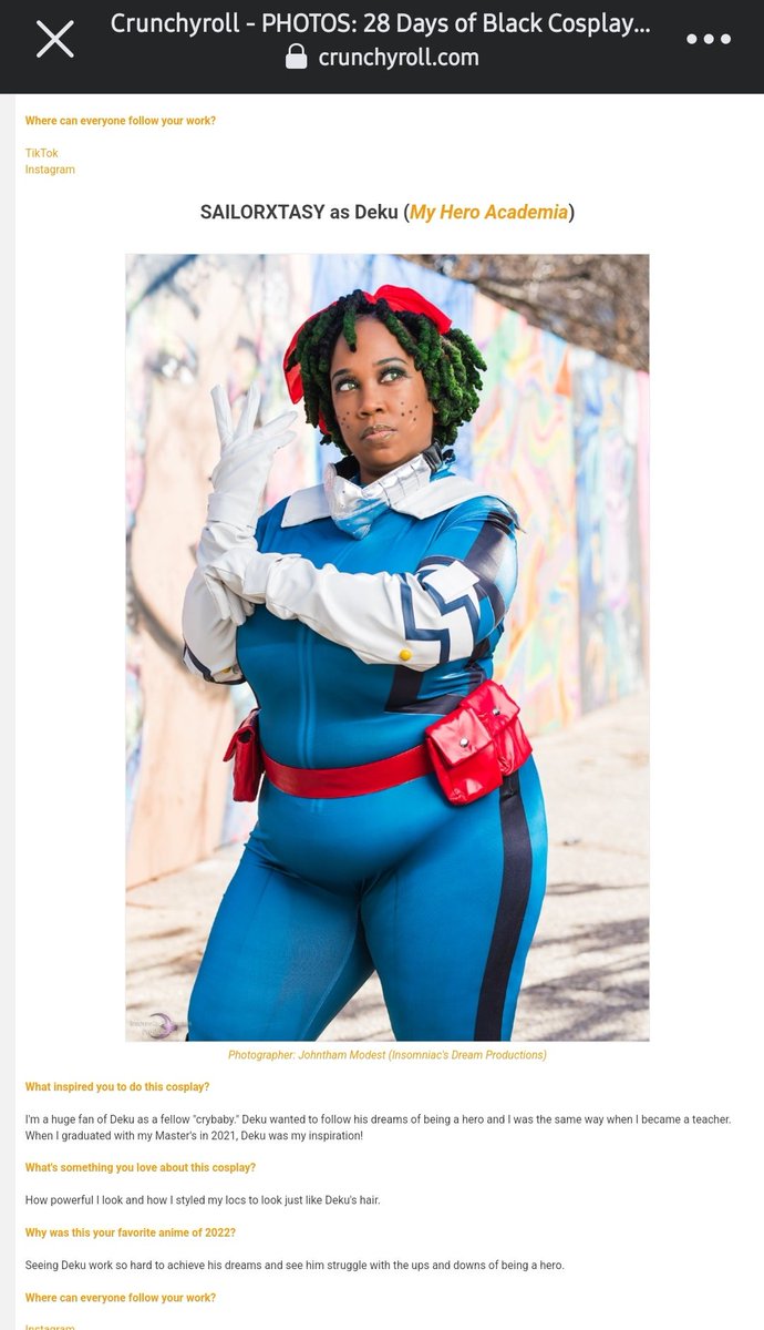 I'm on the @Crunchyroll website for #28DaysOfBlackCosplay and I'M HYPED! check me and other amazing cosplayers on thier website! crunchyroll.com/anime-feature/…