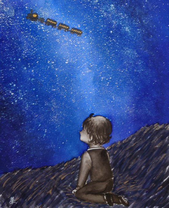 5 21 #今までで作画カロリーMAXの作品上げようぜ 「銀河鉄道の夜」より。 初めて描く夜空の表現に、かなり時間がかかった1枚。 23/03/08 21:55