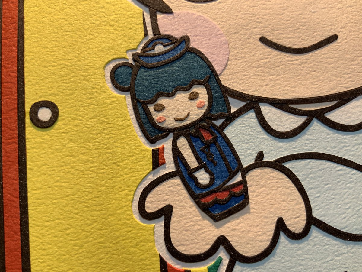 色付けに使うタントペーパーには「流れ目」があり、今回はそれを全て縦方向に揃えています。それによってライティングの向きを変えると紙のエンボス地が一斉に浮かび上がってとても美しいです。 twitter.com/saisenbaco90/s…