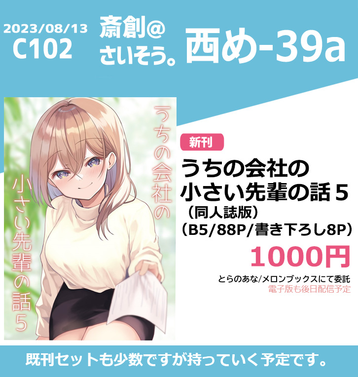 夏コミは【日曜日 “め” ブロック 39a】です。 先輩の漫画5が出ます。 一応既刊セットも持っていきます。 ⬇️⬇️新刊通販開始⬇️⬇️ 🍈 melonbooks.co.jp/detail/detail.… 🐯 ecs.toranoana.jp/tora/ec/item/0…