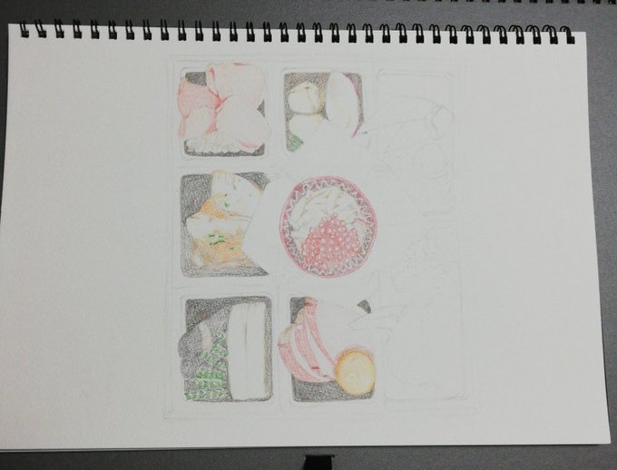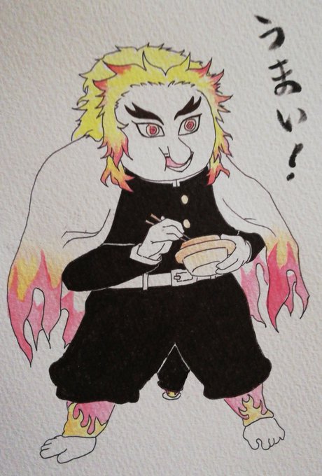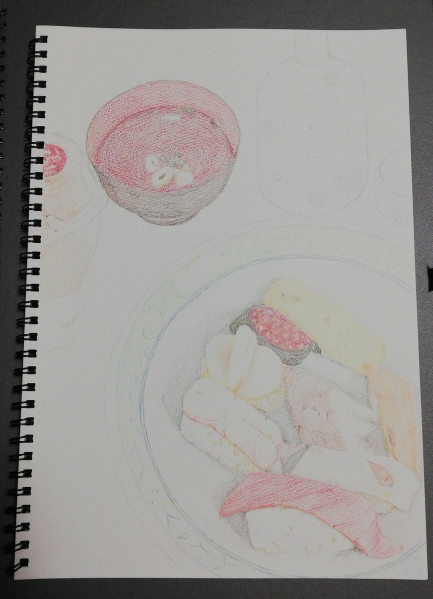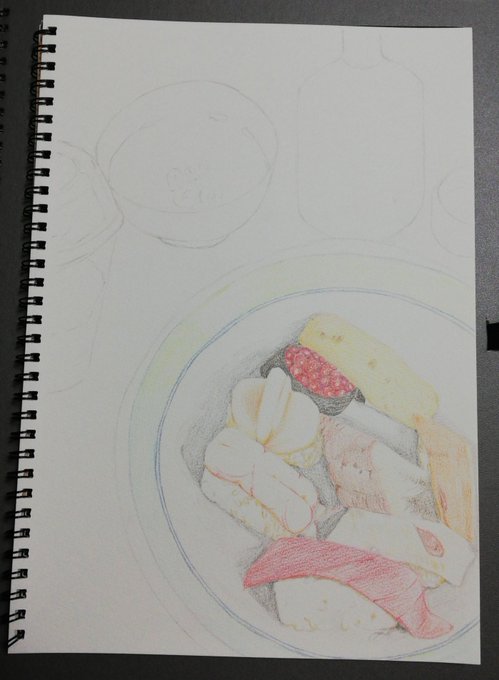 #色鉛筆画 #アナログ絵を流してアナログ民を増やそう #食べ物イラスト #絵描きさんと繋がたい #絵描きさんと繫がりたい 無限列車編を見ながら描くのがいつぞやの朝食の下書きです。 煉獄さん(´;ω;`)ブワッ