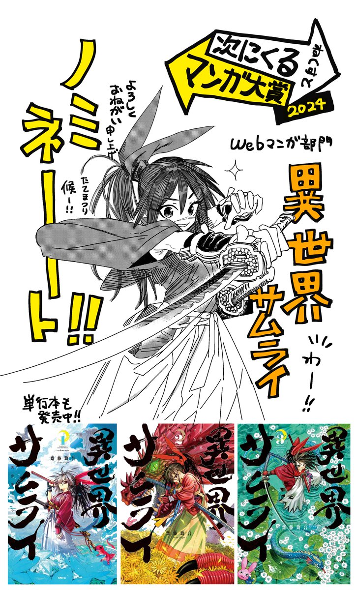 【おしらせ】 次にくるマンガ大賞2024に 『異世界サムライ』 がノミネートされました!! 皆様のご推薦の賜物です……!本当にありがとうございました!今後ももっともっと面白い展開になるよう楽しく描いていく所存です よろしければぜひとも本選のほうもお力添えいただければ嬉しいです!!… x.com/i/web/status/1…