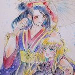#3Color_fairyfale ホルベインさんのキナクリドンスカーレット、カドミウムイエローレモン、セルリアンブルーと主線をシグノのボールペンのピンクで描いてみました 赤ずきんちゃんのイメージです