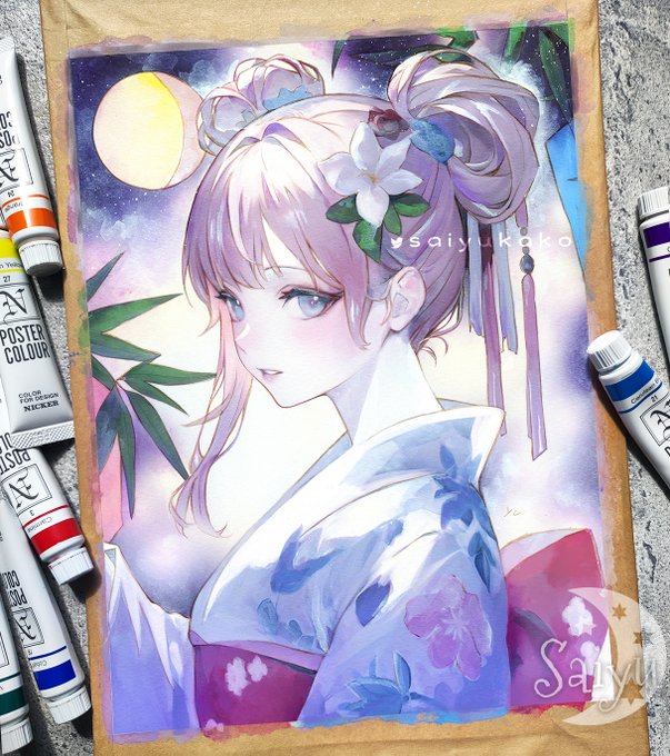 「七夕と浴衣(ゆかた)」 ポスターカラー、透明水彩、パステルなど 雨が降っていてもイラストで七夕の気分を🎋🌌 今日の月の月齢(かたち)です #アナログ絵 #watercolor #創作イラスト #TLを星いっぱいの天の川にしよう