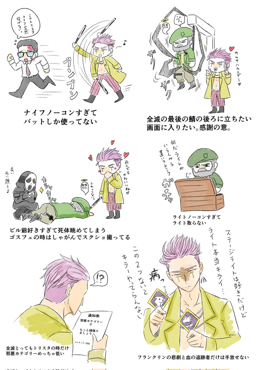 3 5 #デドバ絵日記🏚 キラーでも主にトリックスターでやりがちな事とか😇 最後捧げられる時私も後ろにキラー立って見守って欲しいんだけど誰もやってくれない…もしかして映らないとか?🤔 煽りだと思われる行為なのかな…? 死に際に記念スクショ撮らせて欲しい… 22/10/15 01:51