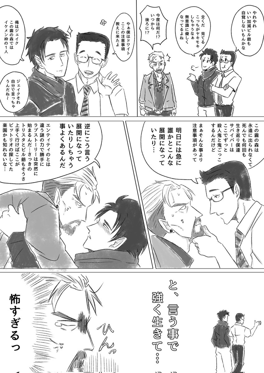 #デドバ絵日記🏚 本家からゾンビアーミー経由からのバイハに就活に来たビル爺と担当面接官ウェスカー。 後に霧の森で出会う。