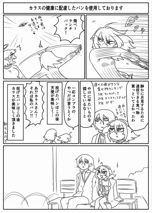 307 1192 番外編・蛇足の落書き1ページです。この後めちゃくちゃお月見堪能した。なお、このランチパックの外袋はマイクロプラスチック問題に配慮した素材が使われており、天使が執念でパンを奪い返したので野生動物への餌付け問題もないものとします(コンプラ) ランチパックは重量があるので飛びそう 22/11/12 13:52
