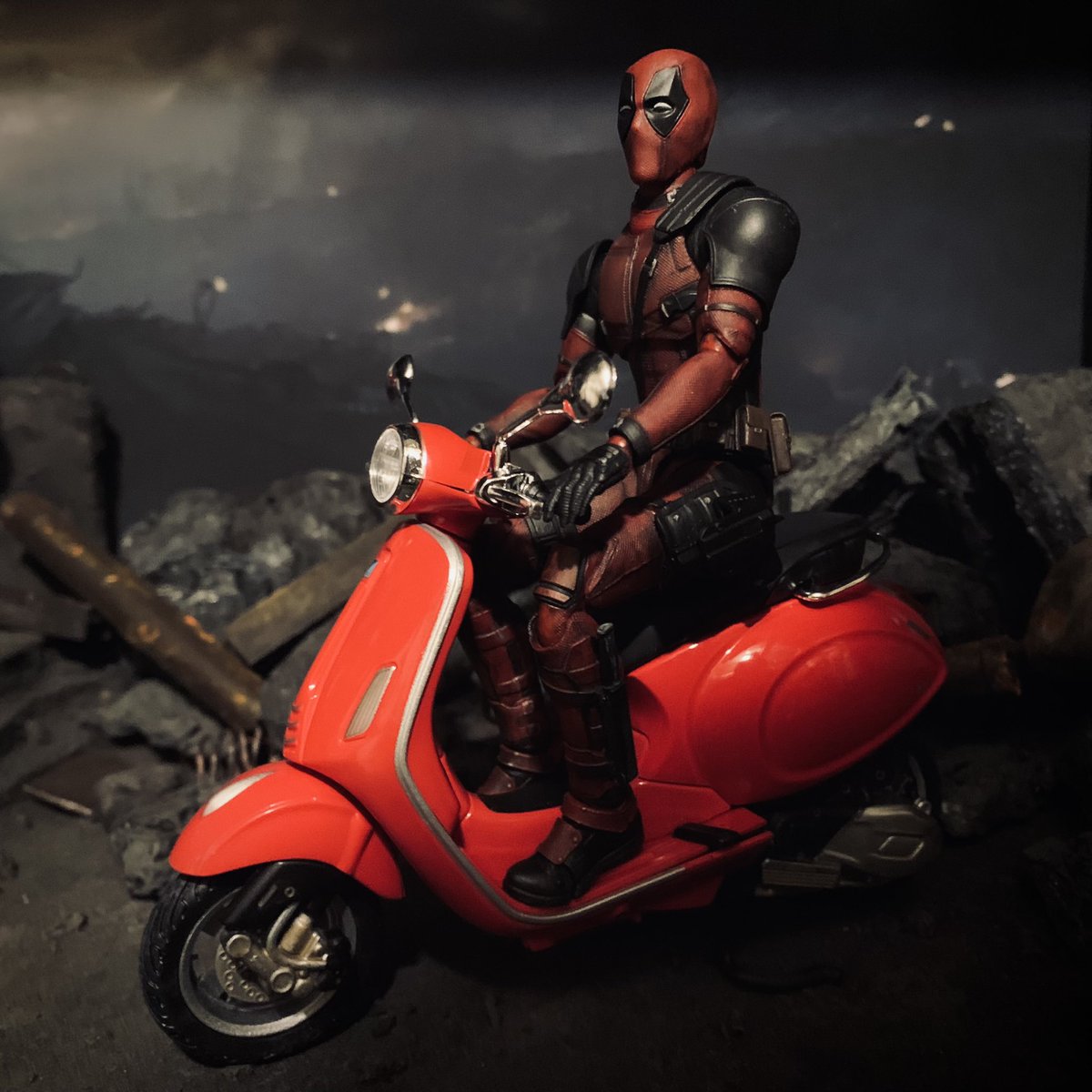 ウェザリングしたデップー、閃回ヘッド&ホルスター、ベスパが来たことにより最強の俺ちゃんが出来上がった!本物いるみたいだ! #デッドプール #フィギュアーツ #オモ写