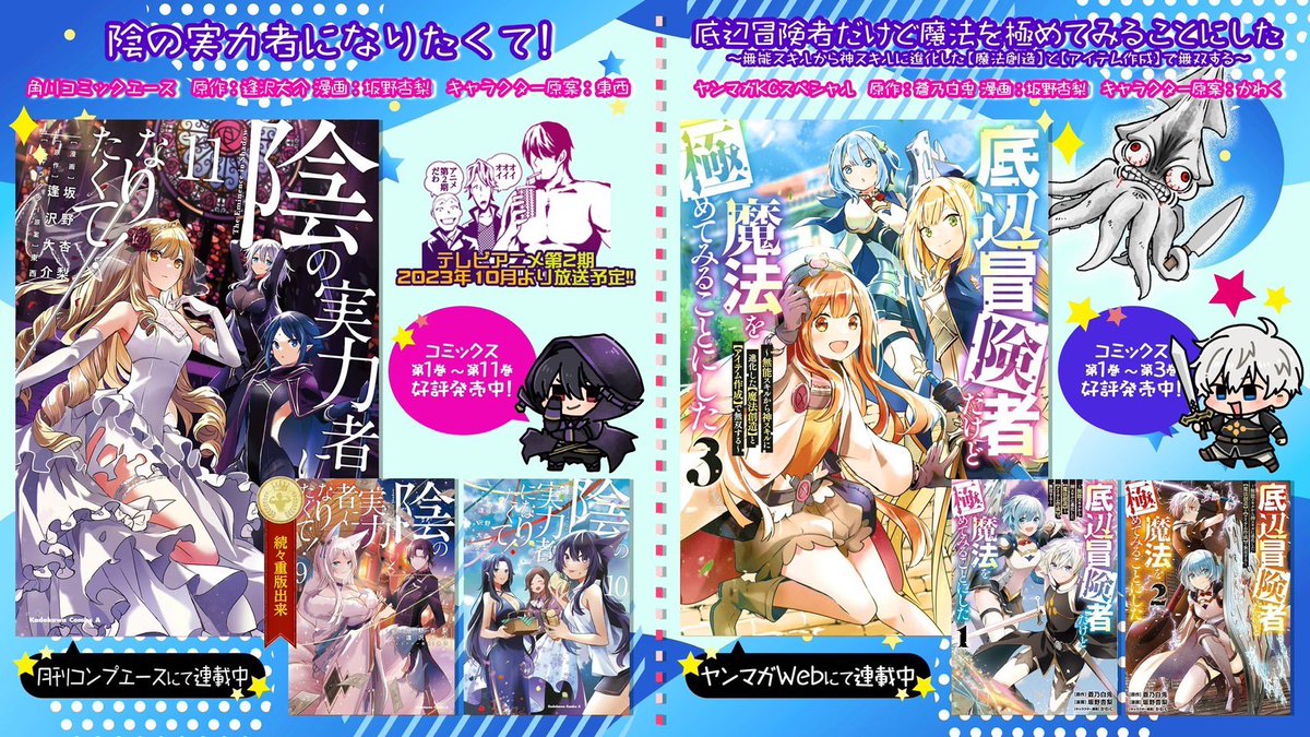 📖担当作品まとめ📖 🏋️「 陰の実力者になりたくて!」 書籍情報&試し読み↓ comic-walker.com/contents/detai… 🧙「底辺冒険者だけど魔法を極めてみることにした ~無能スキルから神スキルに進化した【魔法創造】と【アイテム作成】で無双する~」 書籍情報&試し読み↓ kc.kodansha.co.jp/product?item=0…