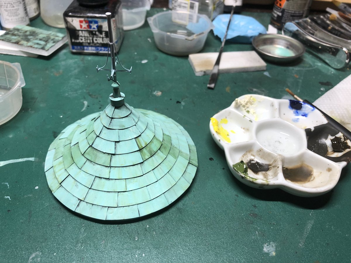 21 111 本日は屋根の色調調整の 最後の工程、艶消しを明度上げ兼ねて丁寧に粗く吹いて完了 作業中は大きな差がわからないけど、工程順に写真を見比べると差がハッキリと解ります。 19/06/06 23:06