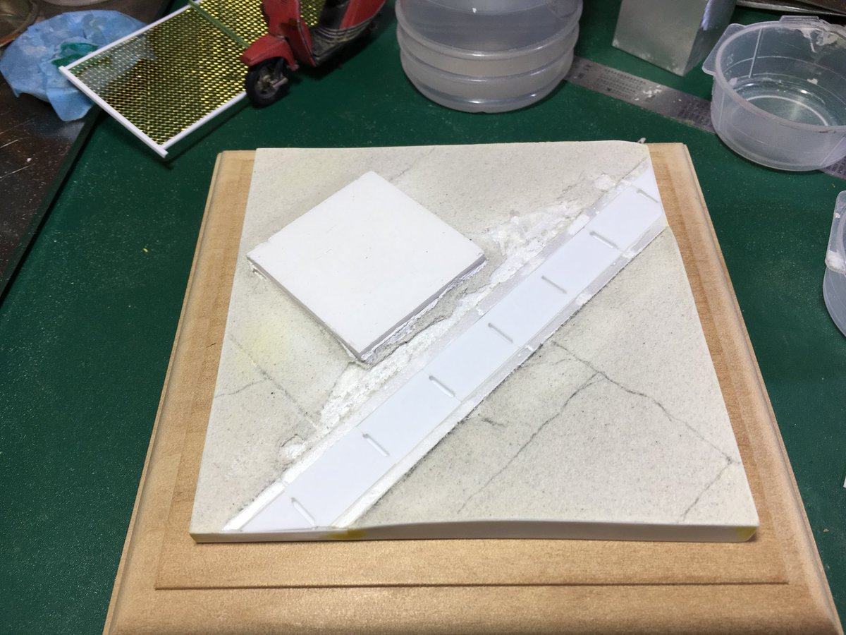 ジェッソの話題で思い出しましたが、 私的にお気に入りの盛り付け材は、 リキテックスのセラミックスタッコ アスファルトの剥がれ表現や補修表現が容易に出来ます。 アスファルト表現は基本コレでやってます。