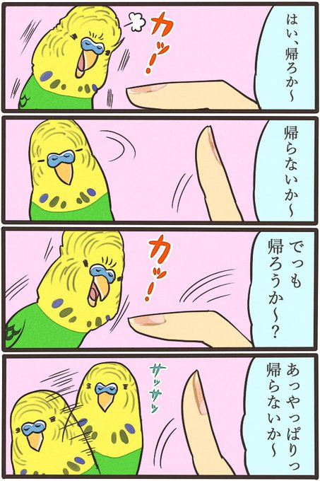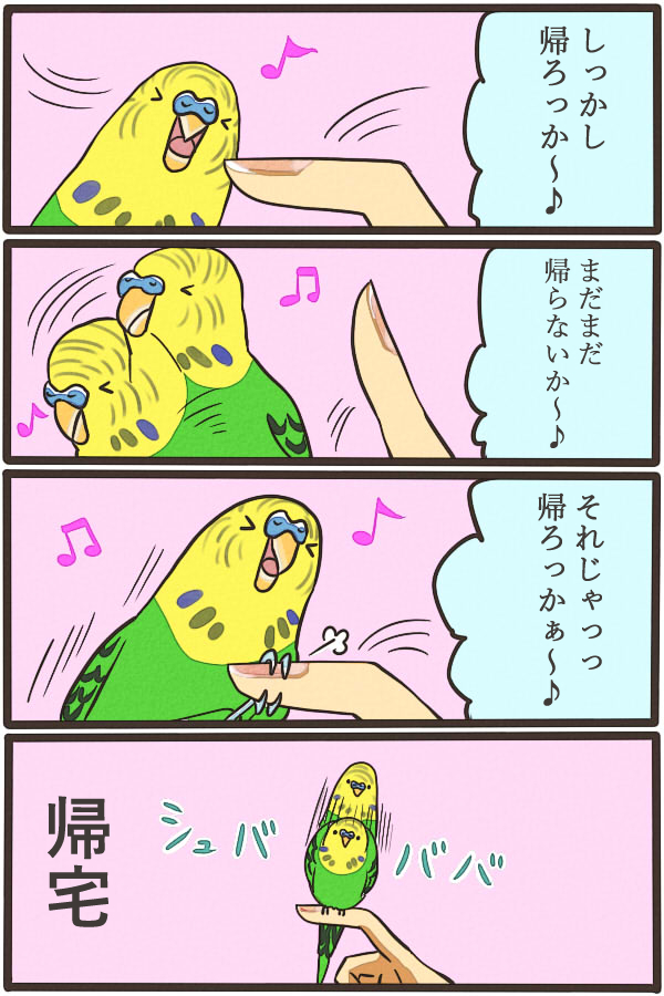 先代インコに通用していた帰宅方法ですが、キハルとシロハルには全く通用しません。頑張って説得しますが、最終的に私にウンコして文句いいながら帰っていく不良インコです。ヤンキーです。