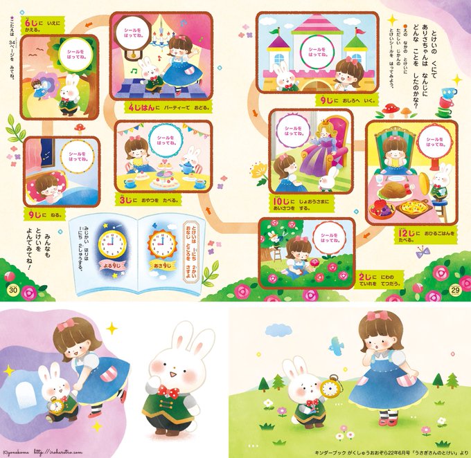 ◇お仕事◇ フレーベル館様/キンダーブック がくしゅうおおぞら6月号「うさぎさんのとけい」の挿絵・シールのイラストを担当いたしました🐰⏰とけいのくにの色々な場面を楽しく制作させて頂きました🌹✨ #よねこめworks #illustraion kinderbook.jp