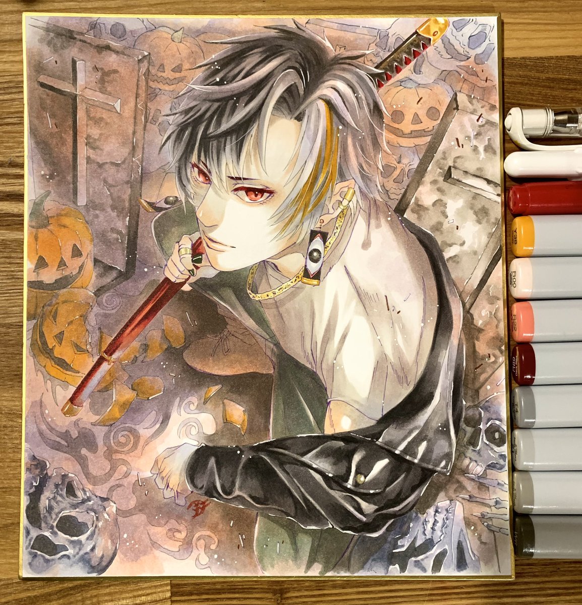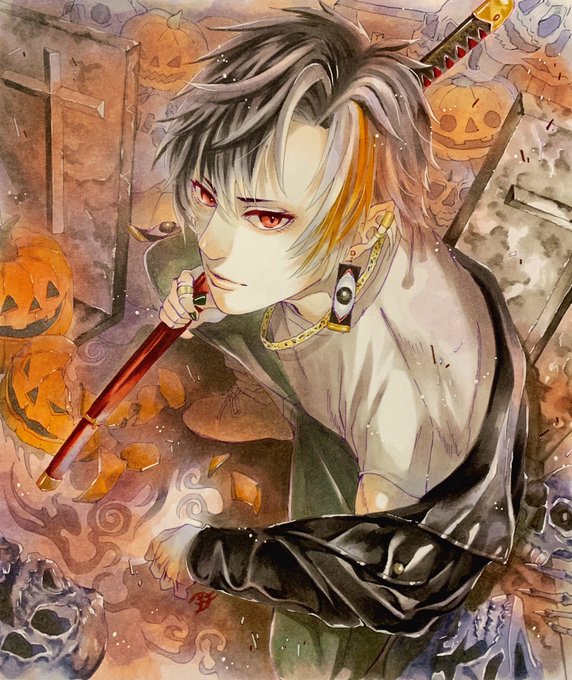 できましたー!やっと!ハロウィンなのに!!w 「死番」 コピック、絵墨、ホワイトペン 「人には死ぬ順番がある。次はあんた?」 下描きでは口元に血を付けてたんだけど出来上がりではやめましたー! #大遅刻ハロウィンイラスト