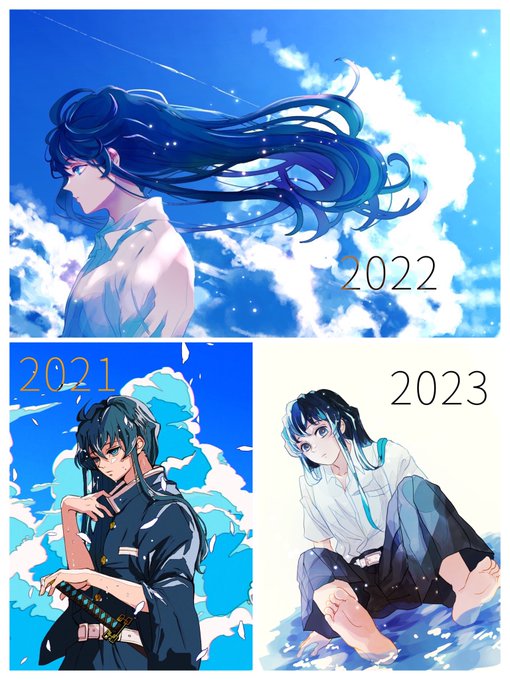 3年間の616絵 梅雨時期のせいか全部青い笑 今年はアニメの影響で目大きめだな…2年前のお顔が1番好みに描けた気がする😂