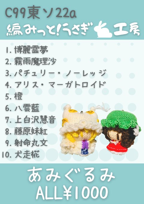 冬コミ2日目東6ホール ソ22a「編みっと!うさぎ工房」のお品書きです。 東方Projectのあみぐるみです。 各キャラの見本はツリーを確認してください。 どうぞよろしくお願いします。 #C99