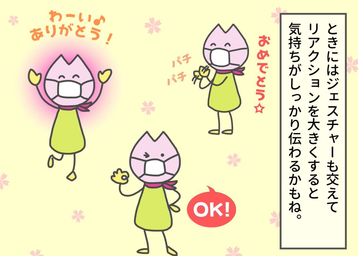 いっふ~☀ さくらいふちゃんだよ🌸 #さくらいふちゃん4コマ マスクは顔の半分が隠れちゃうから、お互いの表情を読み取るのが難しいよね…💦 楽しい気持ちや嬉しい気持ちは相手にちゃんと伝えたいから、体を使って表現してみよう♪ #4コマ漫画 #4コマ #マスク #漫画が読めるハッシュタグ