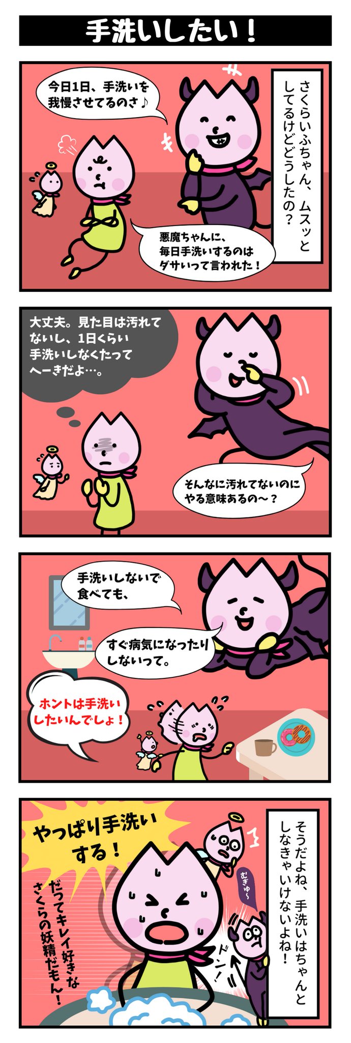 いっふ~☀ さくらいふちゃんだよ🌸 #さくらいふちゃん4コマ✨ みんな、ちゃんと手洗いできてるかな~? 目に見えなくても、手は汚れているんだよ💦 さくらいふちゃんは洗わないと、落ち着かない!!!! #4コマ漫画 #4コマ #漫画が読めるハッシュタグ #衛生習慣 #手洗い