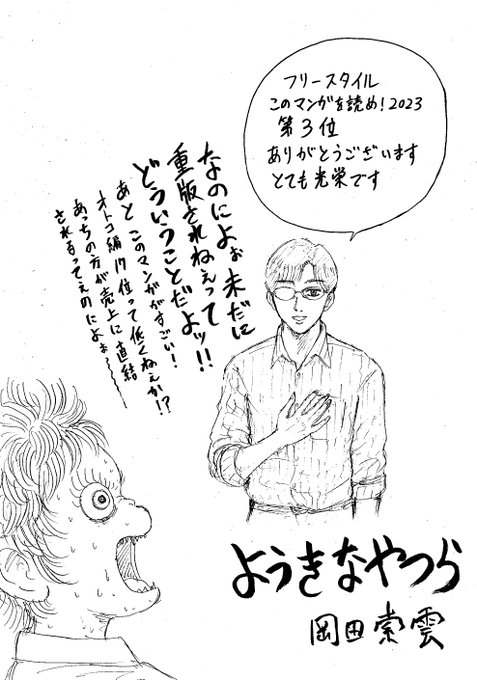 『ようきなやつら』が、フリースタイル「このマンガを読め!2023」にて3位に、宝島社「このマンガがすごい!2023」オトコ編にて17位に入りました。 岡田さんは、鋭意新作準備中です。何か決まり次第ご報告しますので、もう少々お待ちいただければ幸いです。