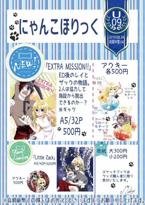 27 71 2019年8月24日、刹那の誓い4のお品書きです! 【U09】にゃんこほりっく よろしくお願いします✨ お取り置きは、当日サークル参加の方かつ相互の方に限り、ご用意させていただきます。 DMでお声がけください。 19/08/12 19:49