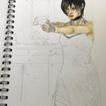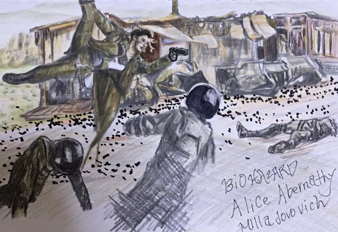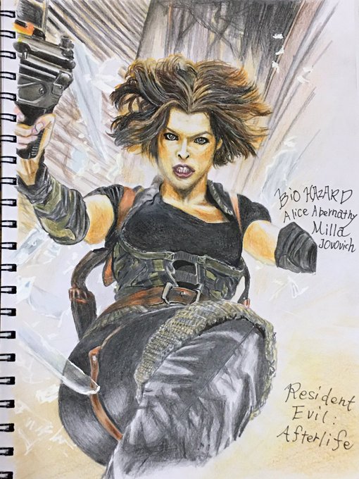 1 8 ちょっと全体図を描いたんですけど、 アリスの顔が1円玉より小さいので、 あなた、誰ですか? って感じですw そして色々と雑な感じに💦 #バイオハザード #アリス #ミラジョボビッチ #イラスト #色鉛筆 #映画 #ゲーム 20/09/11 12:36