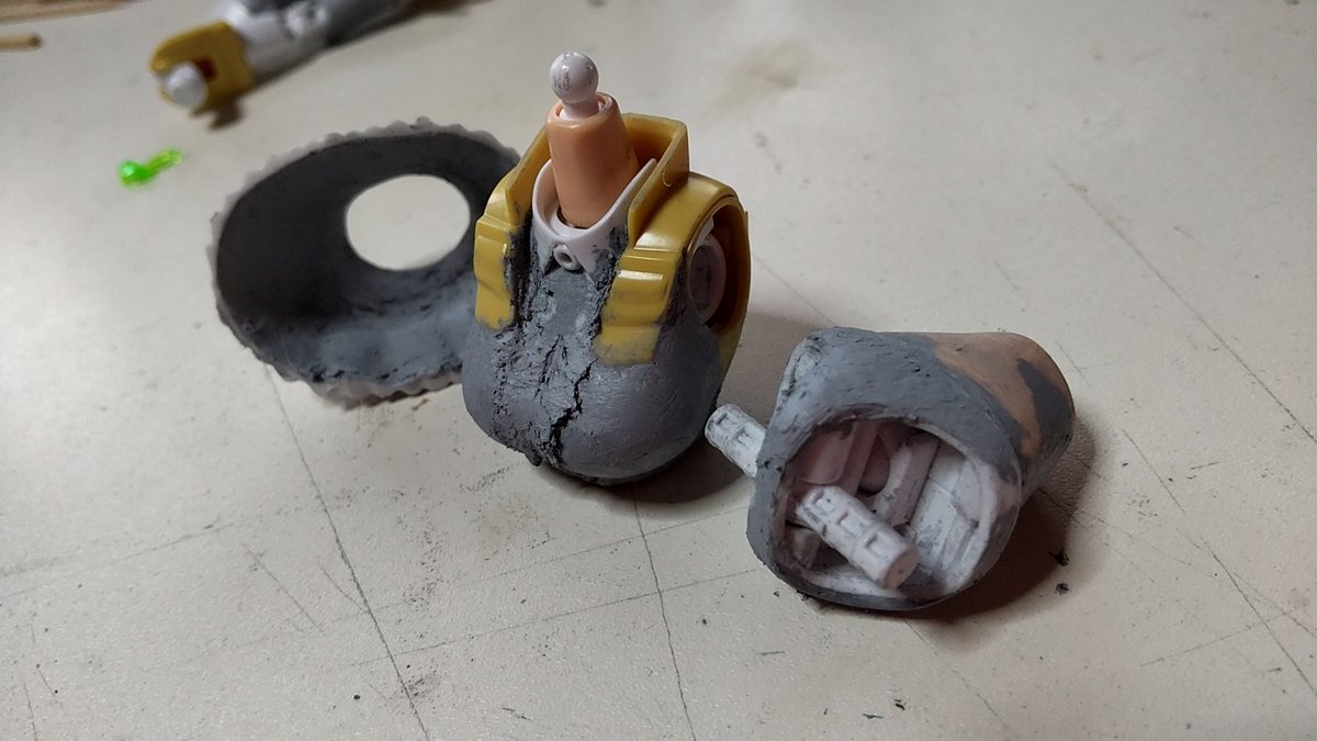 #ガンプラ ローゼンの腹部にプラ板積層してパテ盛りしてる