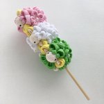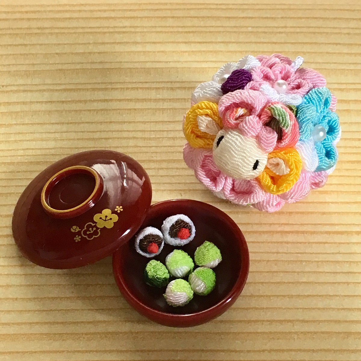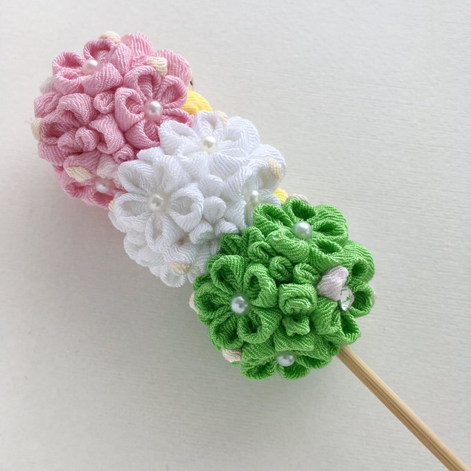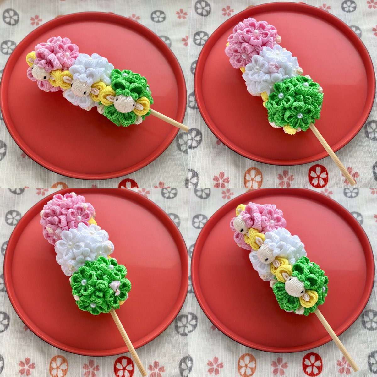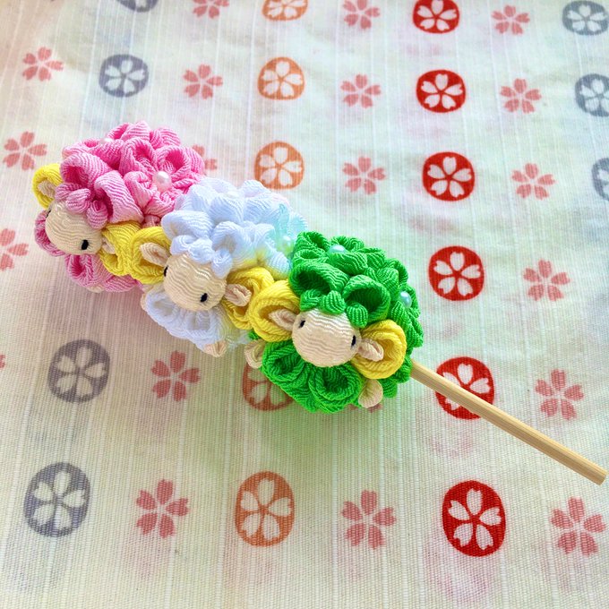 82 414 #砂糖だと思っていたら塩だった系勘違い 三色団子のつまみ細工と見せかけて実は三色団子の羊でした🤣 #つまみ細工 #羊工房 20/05/13 06:29