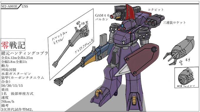 仮想大戦零戦記からUSSポイズンフロッグ。 電磁反発推進を装備した重撃型M2。西欧戦線で大活躍 USSの代表的なM2と呼ばれた。 今後の予定は列島国の主人公三島機。虎徹改を来週に 掲載。その後、予定を早めて零戦記のキャラクター イラスト掲載致します。 #秋の創作クラスタフォロー祭り
