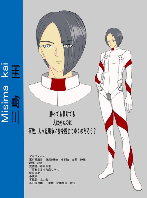 仮想大戦零戦記から主人公 三島開。 戦果の渦に巻き込まれた、小説家志望の青年。 戦争を通じて、彼は何を思い何と戦うのだろうか? INFO 先に掲載した虎徹改。改めて戦国と改称 します。 掲載遅くなり申し訳ないです。 さて、次は本作ヒロイン。谷優子掲載。 #絵描きさんと繋がりたい