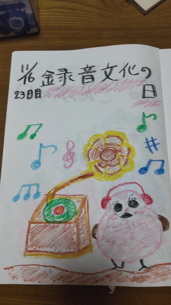 1 14 今日は録音文化の日だそうです イギリス人の方が蓄音機を持参して初めて録音したそうです😃 今はスマホで何でも出来る時代 便利になりました😃 今日もお疲れ様でした! #イラスト #1日1絵 22/11/16 22:44