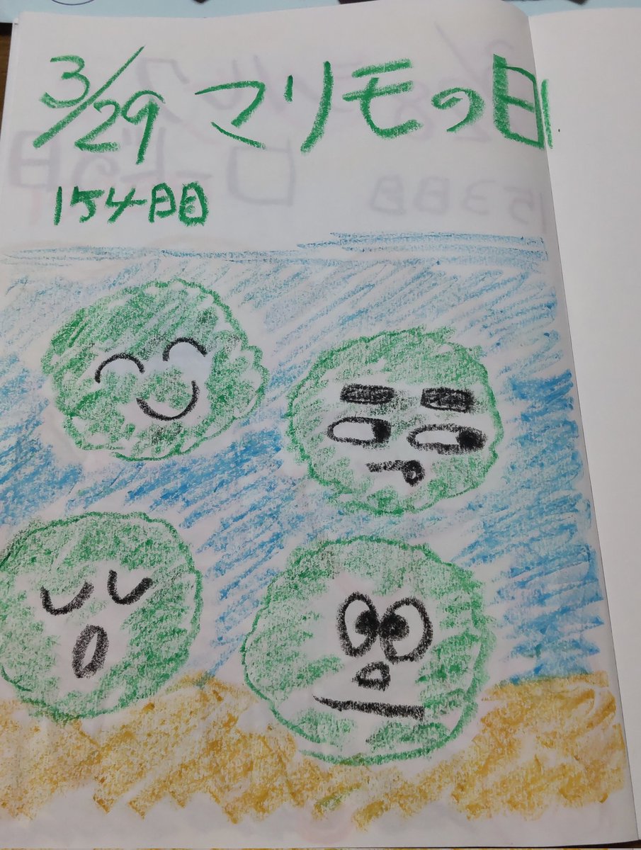 0 4 マリモについて マリモ(毬藻)は、淡水性の緑藻の一種である。球状の集合体を形成するが、球状体一つがマリモの一個体単位というわけではなく、この球状体を構成する細い繊維(糸状体)がマリモの個体としての単位である。#イラスト #1日1絵 23/03/29 22:17