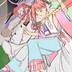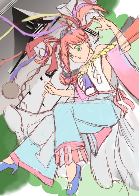#オリジナルイラスト #絵描きさんと繋がりたい 好き勝手に色を塗りたくなったのでオリジナルラフ テーマは「神社娘、宙を舞う」 背中に背負った鳥居の笠木と島木と ハイヒールの『大吉』がお気に入り