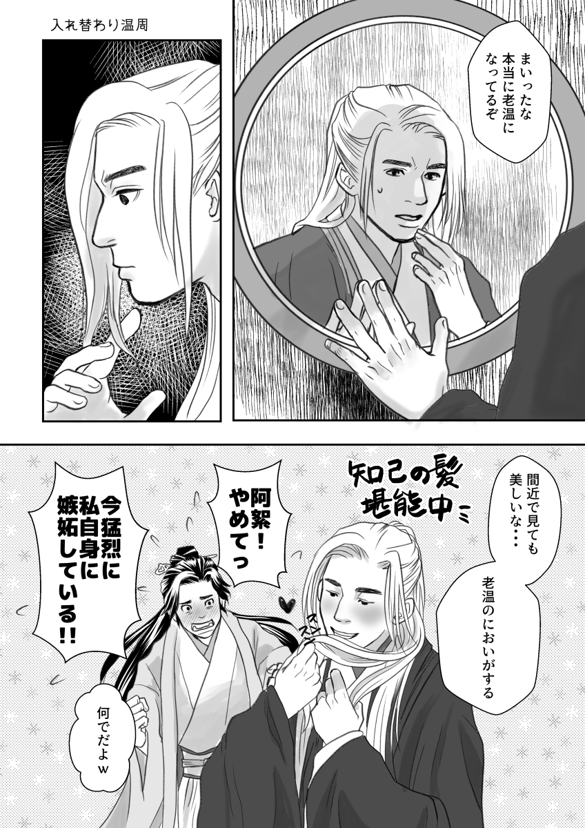 そらさん、Li-さんの入れ替わりネタにあやかって、勢いで描いちゃいました 作中の老温のターンが可愛かったので、阿絮のターンで描いてみた 内容はナイヨー うっとりしっとりした話が描けたらよかったのになぁ😇 あ、指先が荒れてる 背中がむず痒いな? とか色々気付いてお世話させたかったのに twitter.com/sahasaha222/st…
