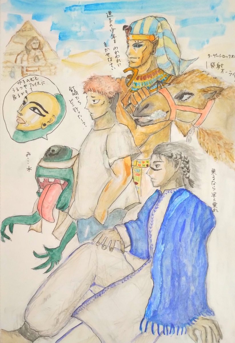 *オタク妄想注意* ナナミンの引率で海外任務にやってきた高専トリオ。 みんなとはぐれた虎杖を待ちうけるのは、観光客をカモる悪いラクダ業者。この後ひと悶着あって、なんだかんだ共闘するのかも… #呪術廻戦ファンアート