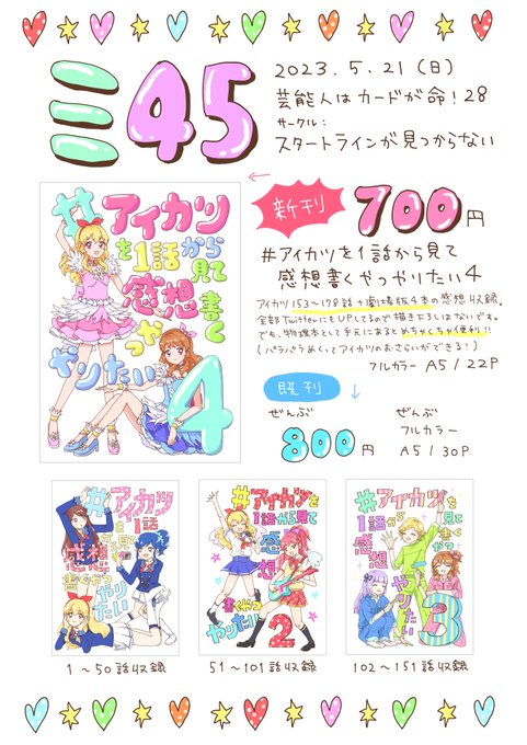 43 117 来週の芸カ28のお品書きです📝 サークル『スタートラインが見つからない』 スペースNo. ミ45 新刊は #アイカツを1話から見て感想書くやつやりたい のまとめ本最終巻です🆕 フルカラー/22P/700円 既刊も刷ったので持っていきます!よろしくお願いします🩵🩷 #芸カ28 #芸カ28お品書き 23/05/13 12:05