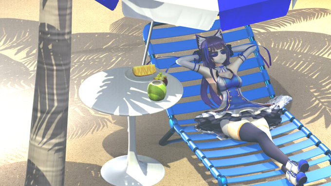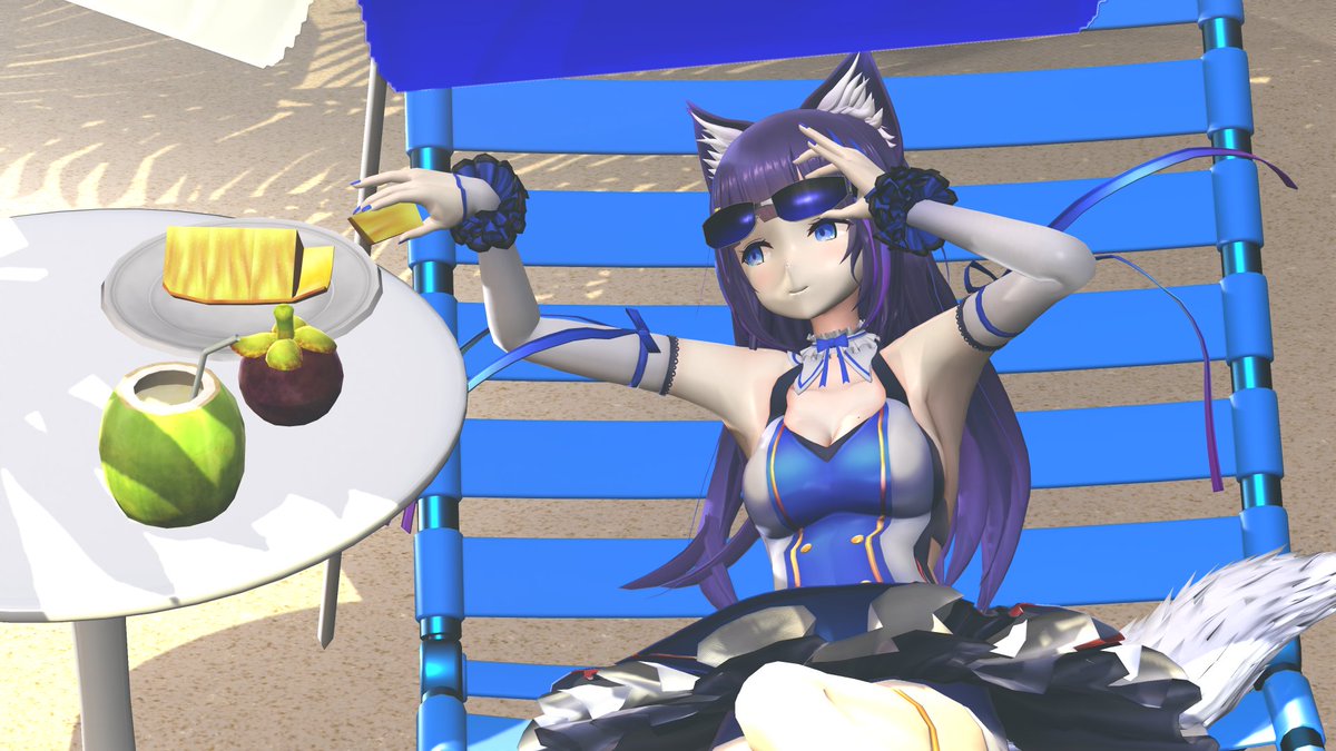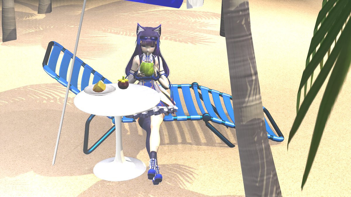 南国バカンスこころちゃん #画狼伝説 モデル:吉花こころ様 ヤシの木と砂浜:おおい様 多機能型サングラス:アサシンP様 ビーチパラソル:ねこま様 ビーチチェア:のべ男様 チュー○ップチェア、チュー○ップテーブルっぽいチェア&テーブル:MIT$U様 南国果物セット:キャベツ鉢様 sdPBR:サンドマン様