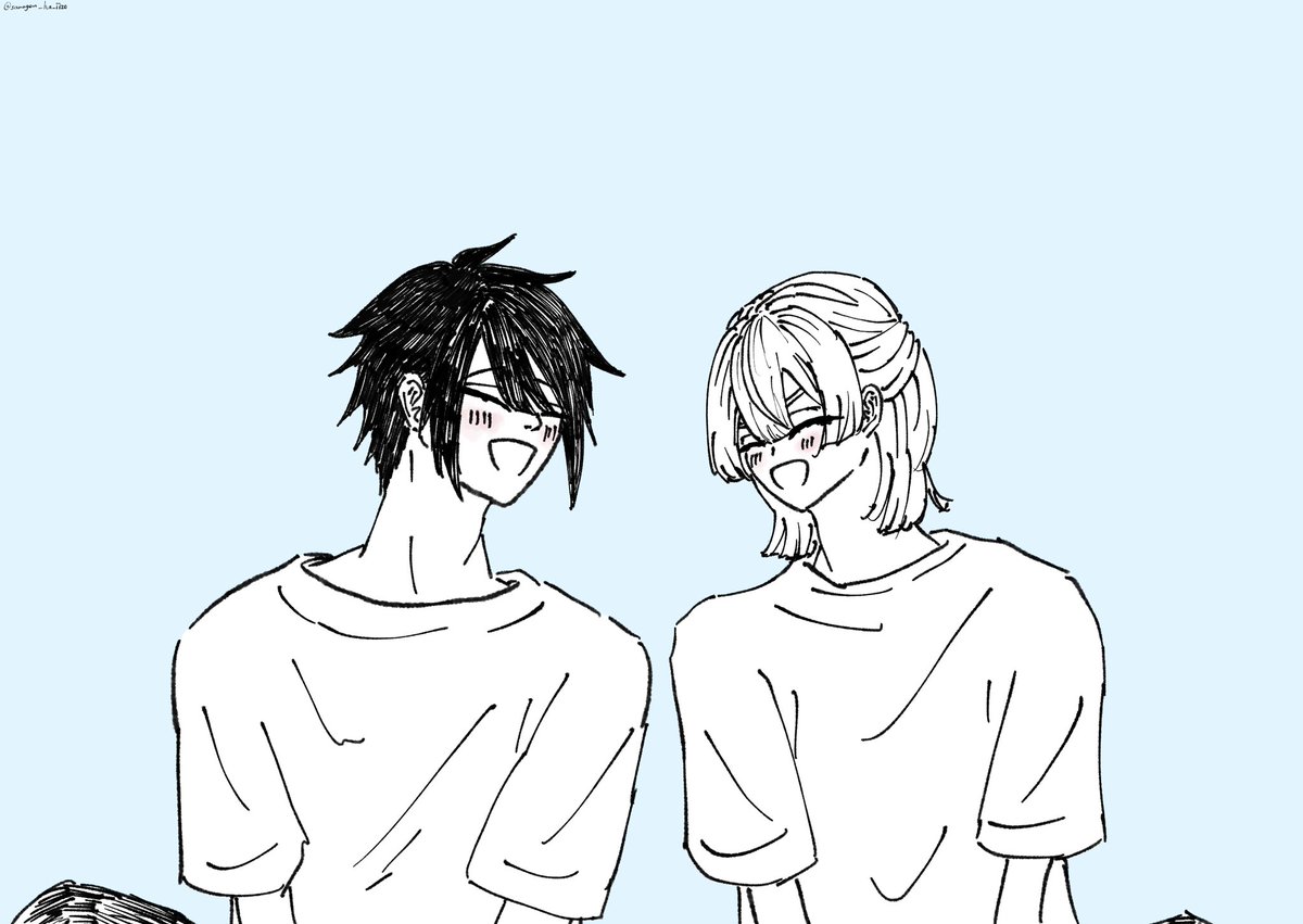 0 2 #一日一絵 679日目 #長尾百景 #上弦画 昨日のスプラで作戦会議(?)してたの可愛かったなと思ってたら思いついた絵 23/07/12 00:03