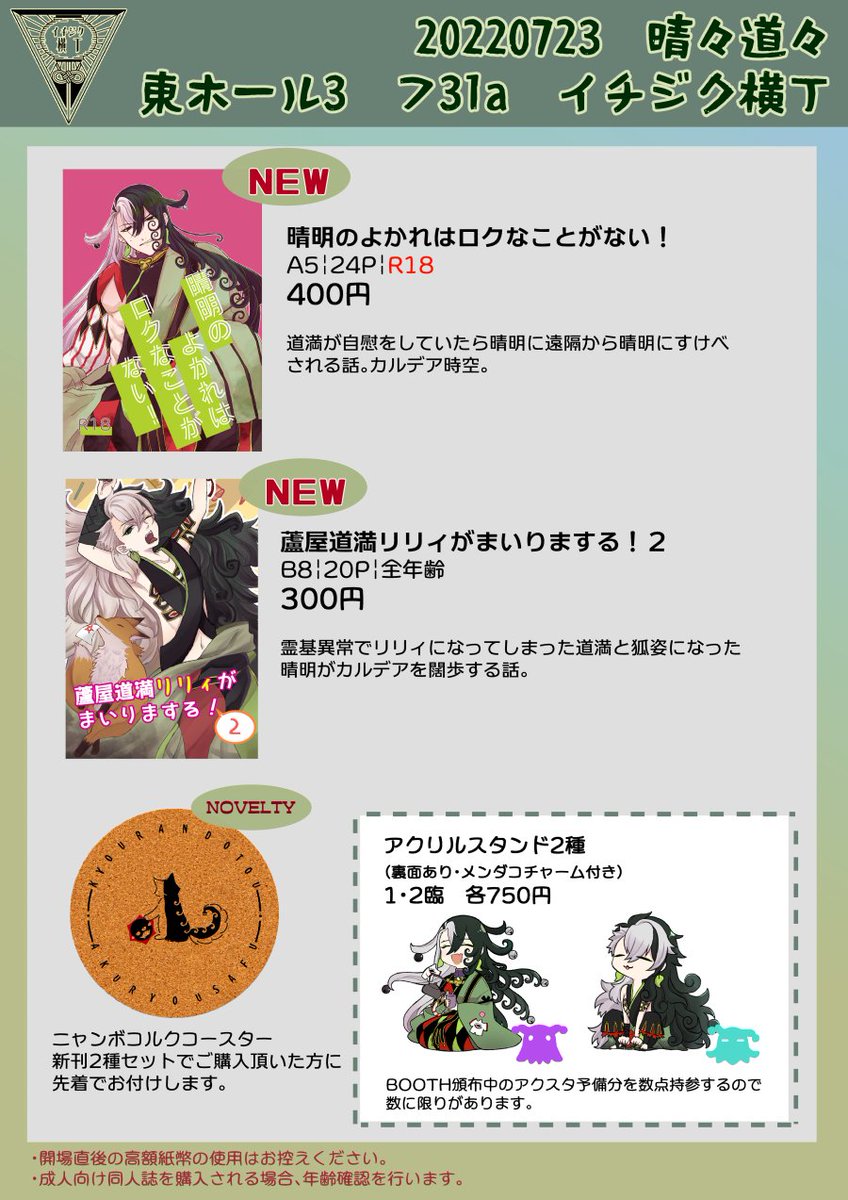 【7/23晴道オンリー 晴々道々】 東ホール3 フ31a「イチジク横丁」 新刊は2種です!新刊2種ともご購入頂いた方には先着でコルクコースターをお付けします。 また、予備分で手元に残っていたアクスタも持参します。 当日は年齢確認ができるものをお持ちください。