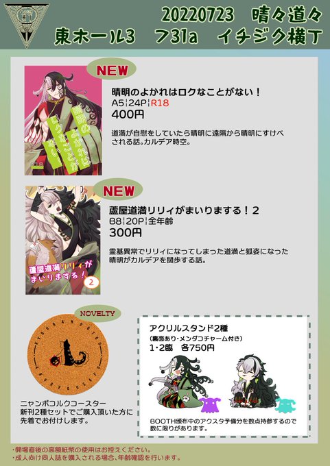 46 50 【7/23晴道オンリー 晴々道々】 東ホール3 フ31a「イチジク横丁」 新刊は2種です!新刊2種ともご購入頂いた方には先着でコルクコースターをお付けします。 また、予備分で手元に残っていたアクスタも持参します。 当日は年齢確認ができるものをお持ちください。 22/07/13 19:08