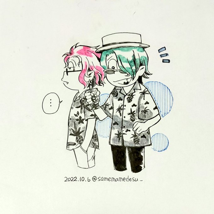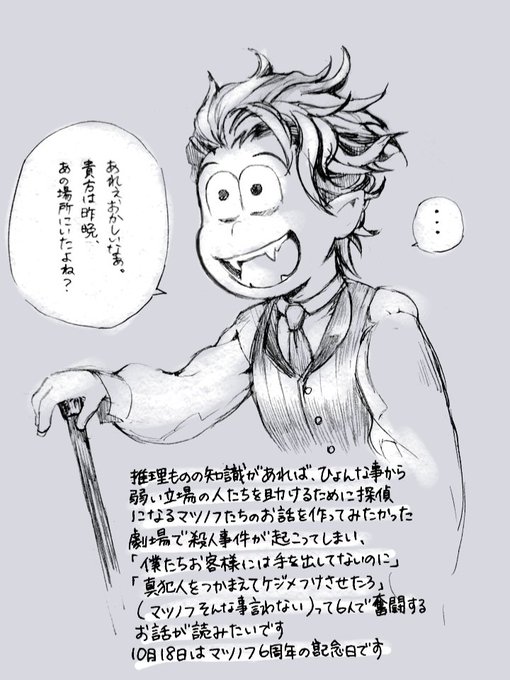 #インク松月間 #インク松月間2022 へそウォunlimitedの表紙(告知画像)でチョロマトゥは何で無印の衣装ではなくサマーの衣装なのか? 答えは『アンティークショップ』だった、サマーの攻撃モーションでアンティークの露店を開いてたから、ヒントだったんだ…!!って気付いて笑顔でお絵描きした☺️