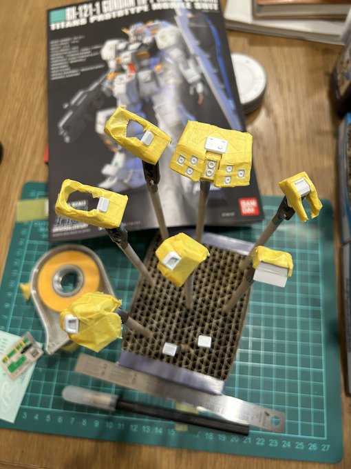 #ガンプラ #ガンプラ好きと繋がりたい #ガンプラの画像を貼るとRTされると聞いて #AOZ HGUC ヘイズル改 塗装編 マスキング準備中です! 果たしてこんなんで上手くいくのか… 上手い人達の技術と集中力には遠く及ばないと実感できました!