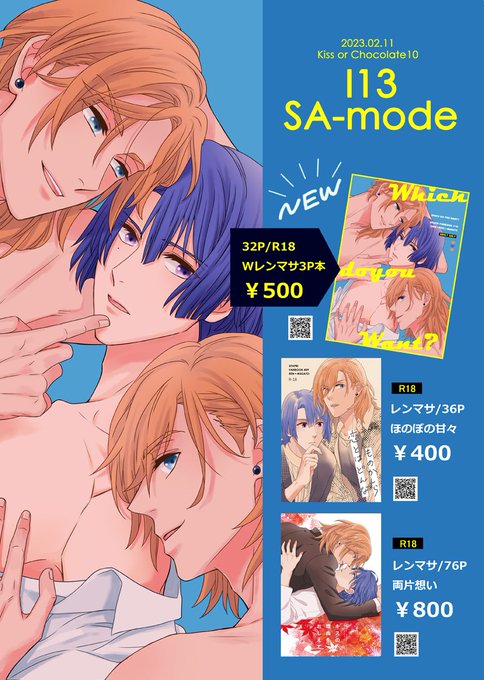 2/11(土) キスチョコ10🧡🌹 📝お品書き I13/SA-mode 新刊 Wレンマサ3P本🧡💙🧡 サンプル:pixiv.net/artworks/10499… 🐯通販:ec.toranoana.jp/joshi_r/ec/ite… 既刊2種はどちらも残部僅少です。 よろしくお願いします!
