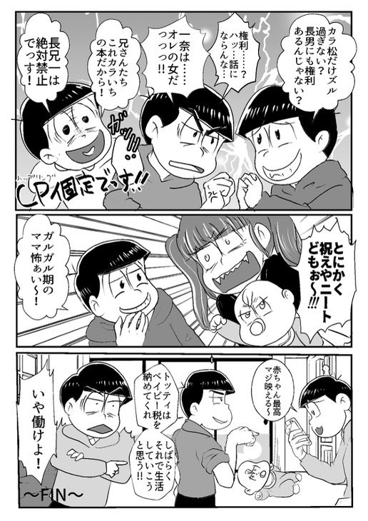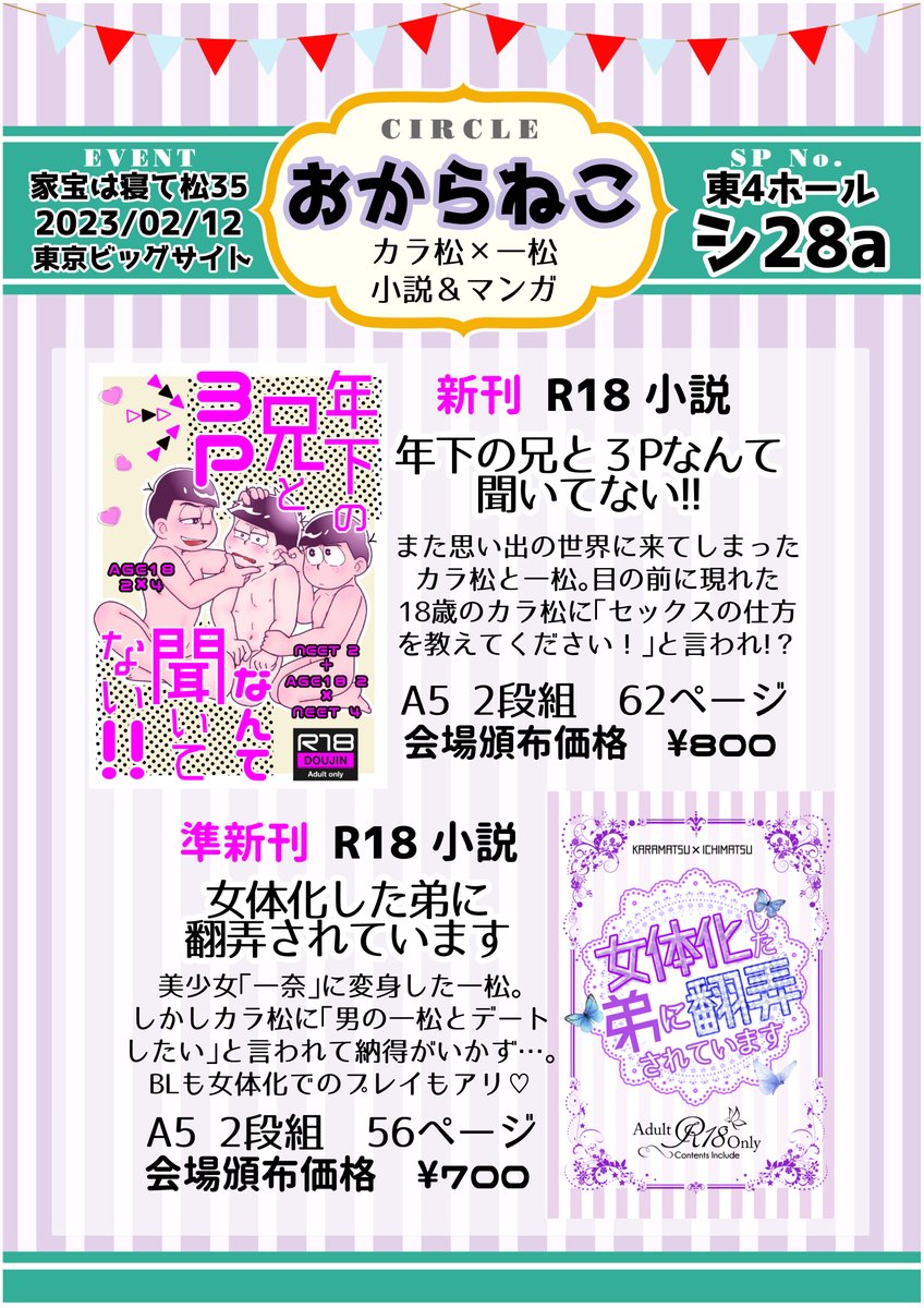実際はこれよりもさらに茶色の表紙&本文用紙になります。 これ!めちゃめちゃ!良いので!!! 四男がこっそり夜中に簡単な料理を作っては兄弟に見つかってしまうんですが最後は色松(兄弟の範疇)なんですよ!!!最高。 サンプルはトッティとチョロちゃんに見つかるところ。 pixiv.net/artworks/89797…