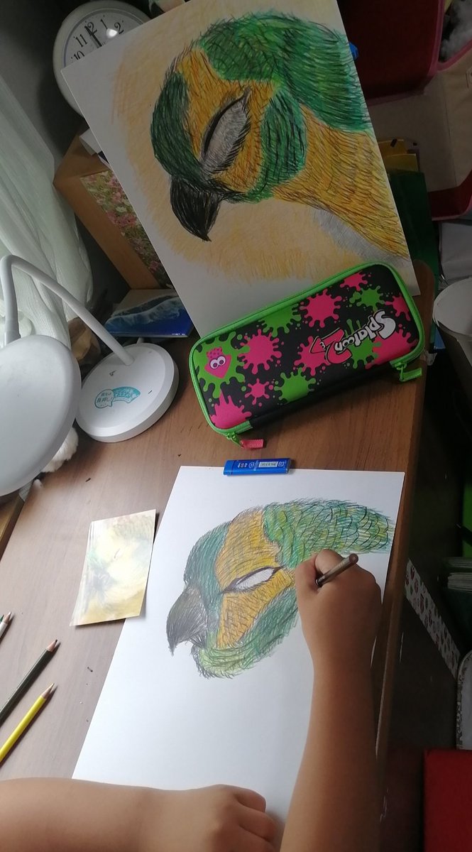 嵯峨山 @sgym_phtさんの #ゴシキセイガイインコ の写真に魅了されて、 #小学6年生 の息子が絵を描きたいモード、スイッチオン🎨 『ああ!絵が楽しい♬この子かわいいんだよぉ〜❣』とルンルンで #色鉛筆画 に燃えています🔥 毎度ながら #やる気スイッチ 探すのも一苦労だなぁ😂(笑) twitter.com/sgym_pht/sta…