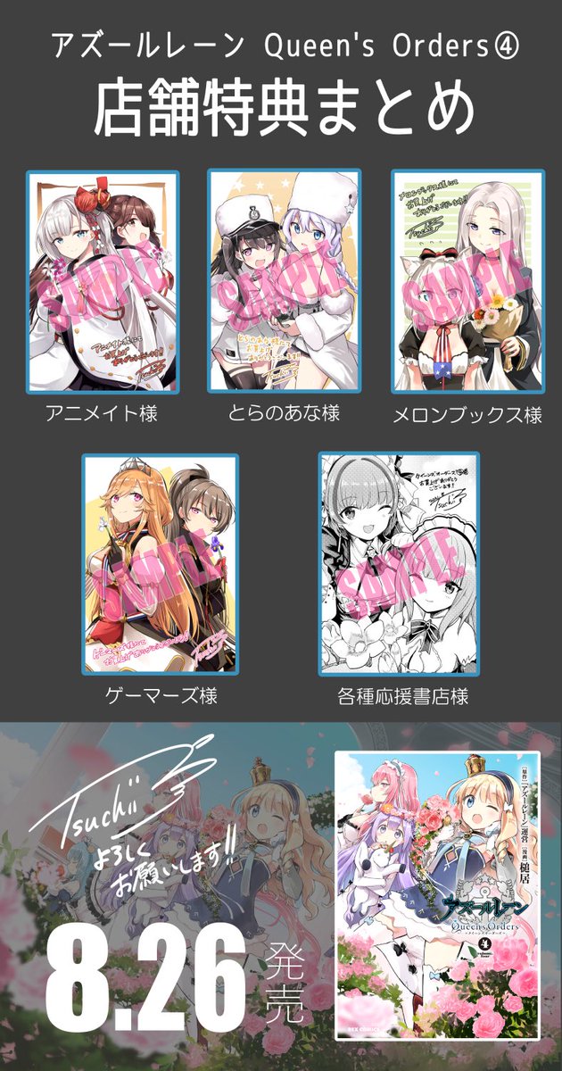 【宣伝】クイーンズオーダーズ4巻8/26(木)発売です。 各店舗特典のまとめを作りました。カラーはイラストカード、モノクロはペーパーです。よろしくお願いします( ´ ▽ ` ) #アズールレーン #クイーンズオーダーズ