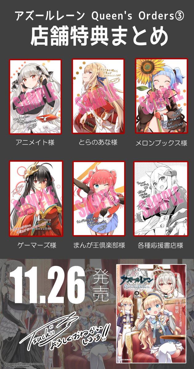 【宣伝】クイーンズオーダーズ7巻 7/27(木)発売です。 各店舗特典まとめはこちら。カラーはイラストカード、モノクロはペーパーです。よろしくお願いします! #アズールレーン #クイーンズオーダーズ